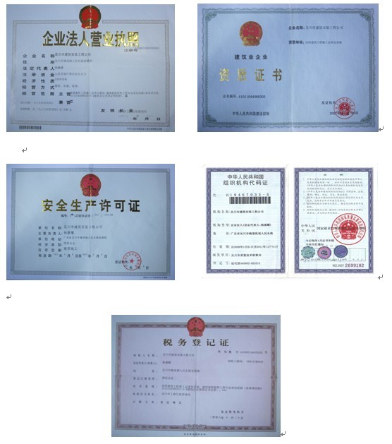 企業(yè)法人營業(yè)執(zhí)照;資質(zhì)證書;安全生產(chǎn)許可證;組織機(jī)構(gòu)代碼證;稅務(wù)登記證: