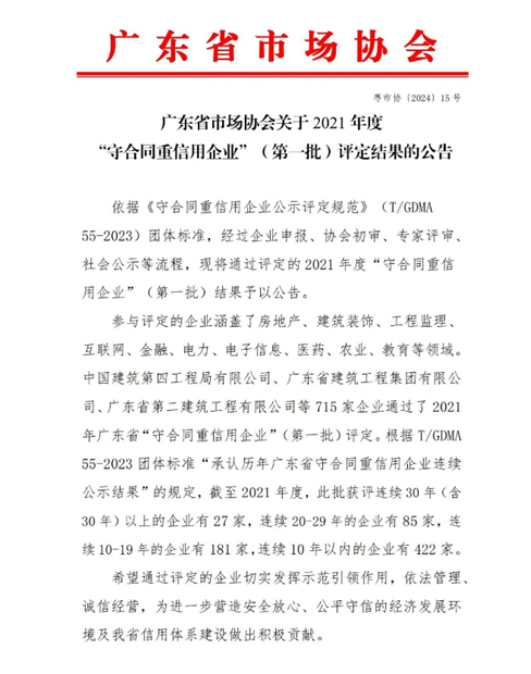 近日,廣東省市場(chǎng)協(xié)會(huì)發(fā)布了2021年度“守合同重信用企業(yè)”(第一批)評(píng)定結(jié)果,我公司榮耀再續(xù),連續(xù)三十五年“廣東省守合同重信用企業(yè)”稱(chēng)號(hào)。獲得此榮譽(yù),不僅對(duì)公司實(shí)力的認(rèn)可,更是對(duì)誠(chéng)信經(jīng)營(yíng)和優(yōu)質(zhì)服務(wù)的肯定。